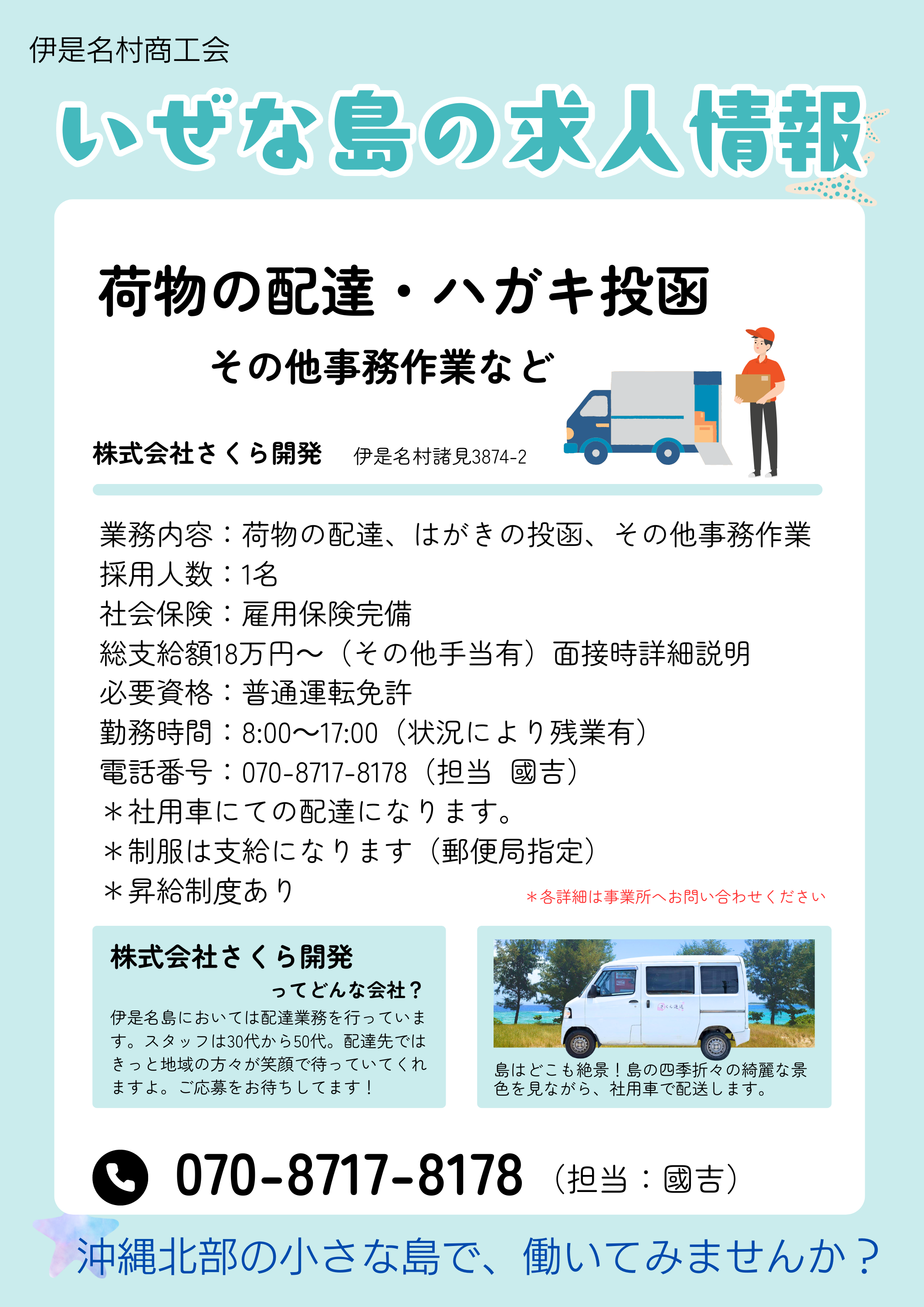 2024年8月16日 / 最終更新日時 : 2024年8月16日 izeshoko 伊是名島の求人情報 【求人】荷物の配達・ハガキの投函・その他事務作業株式会社さくら開発では荷物の配達・ハガキの投函・その他事務作業を行う職員を募集しいています。 各詳細情報については、事業所に直接ご確認ください。【伊是名島に住む】 伊是名村には村営住宅(2DK以上)および、定住促進住宅(1R)があります。 詳細は伊是名村役場 建設環境課 0980-45-2004へお問い合わせてみてください。 FacebookXBluesky