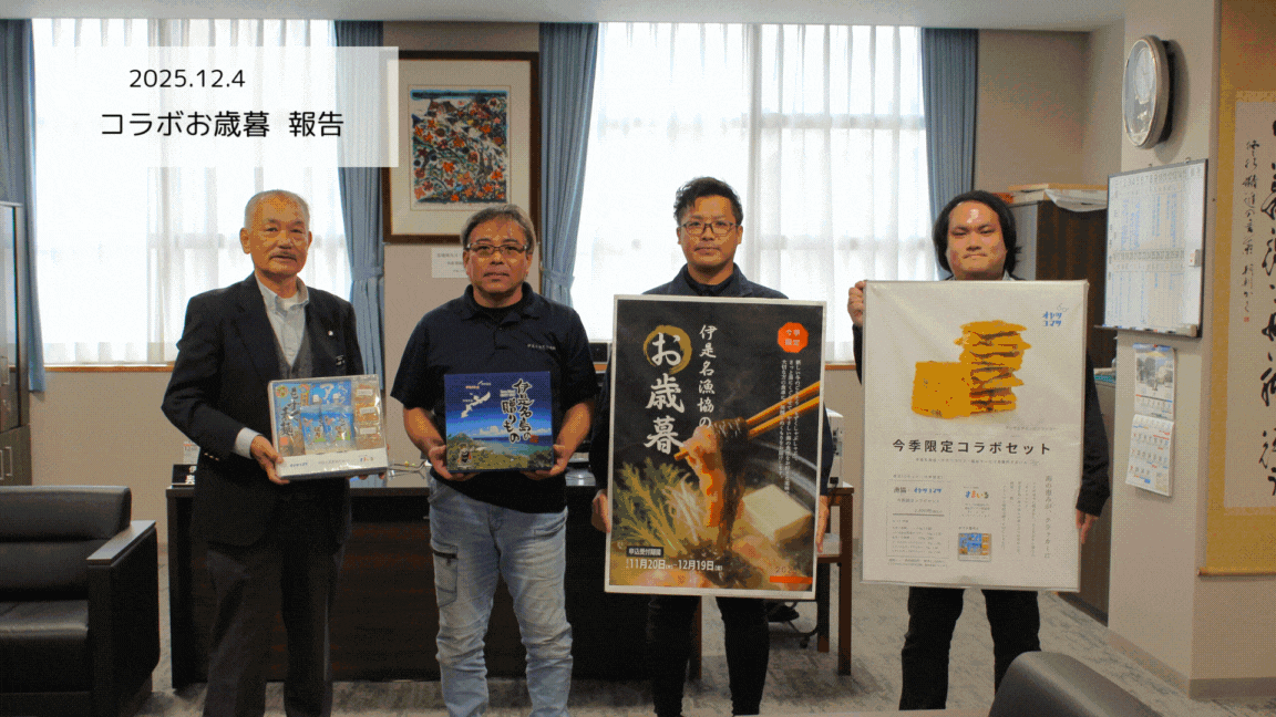 今年の伊是名漁協コラボお歳暮セットの取り組みについて、漁協理事・課長・商工会職員の三者で村長室を訪れ、報告を行いました。