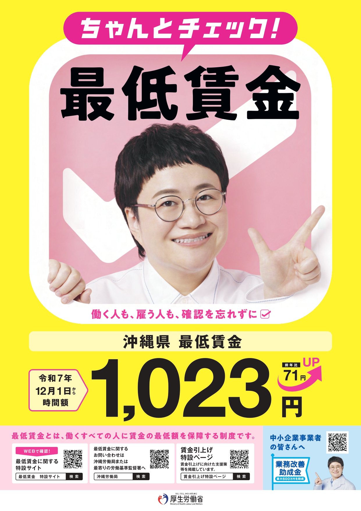 沖縄県最低賃金は、時間額1,023円(令和7年12月1日から発効)となります。