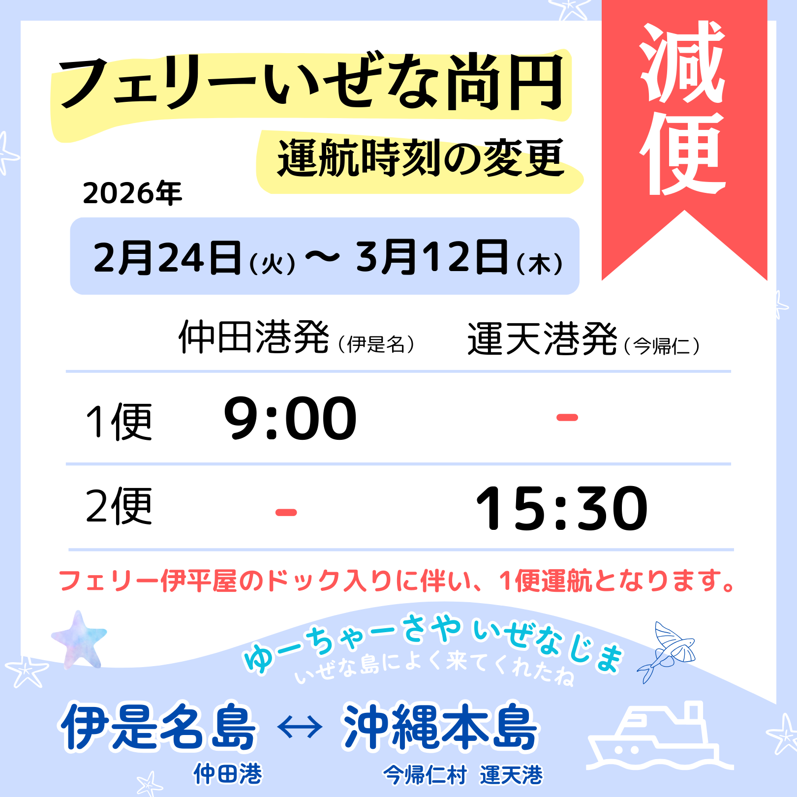 2月24日(火)~3月12日(木)まで、フェリーいへやのドック入りに伴い、「フェリーいぜな尚円」は減便します。