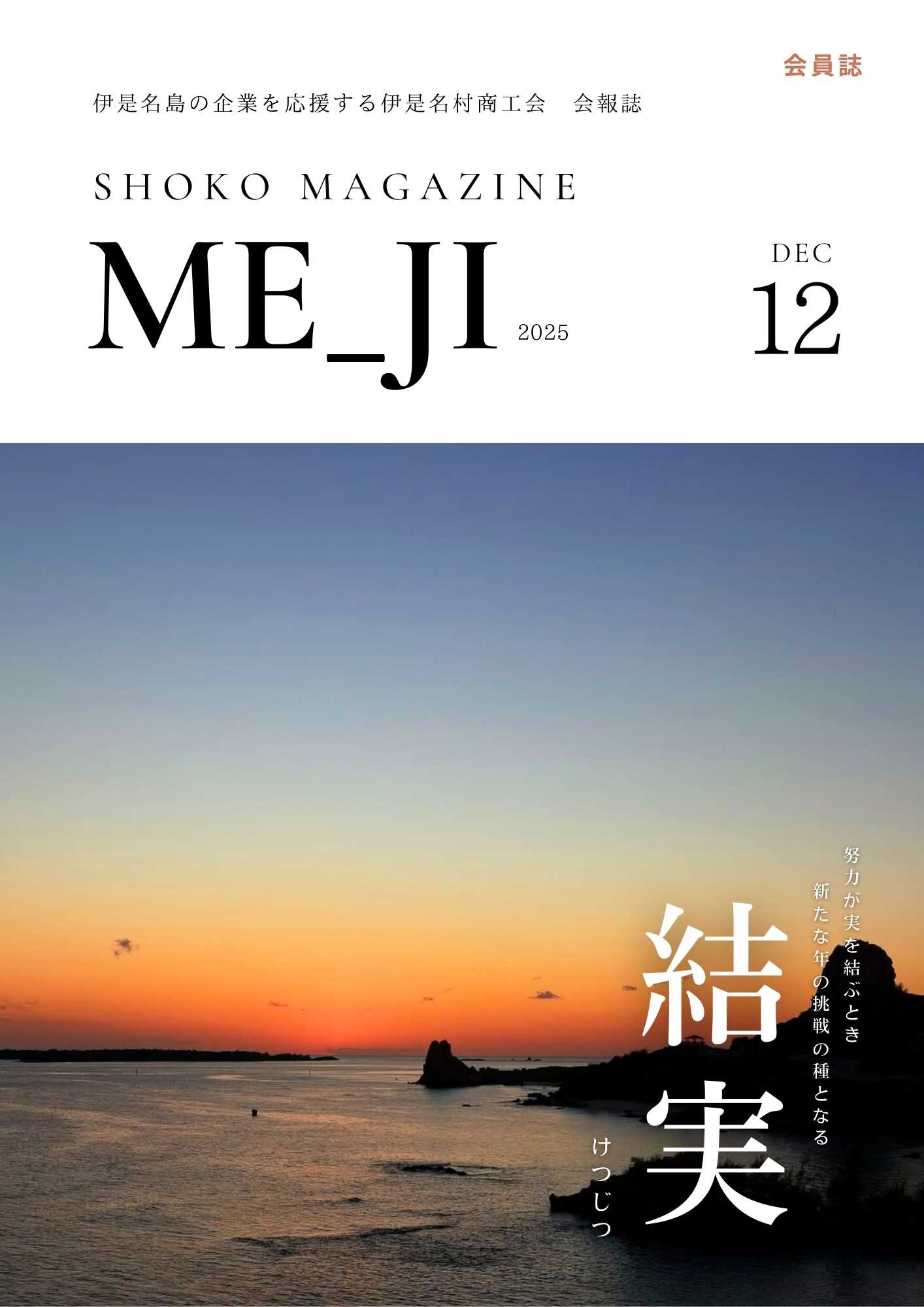 | ME_JI 企画・編集・発行:伊是名村商工会 年4回発行 無料会員誌会員誌の誌名となった「ME_JI」(メージ)とは、伊是名島の古い呼び名です。 前の島を意味する(メージ)が伊是名島で、後ろの島を意味する(クシジ)が伊平屋島です。 伝統 文化、風土 風習、自然や島人の温かい心を受け継ぎつつ、新しい角度から島を見つめ、切り開き前進するようネーミングしました。 会員の皆様にとって有益な情報をお届けすることができる一冊となるよう精進致しますので、今後とも宜しくお願い致します。 |